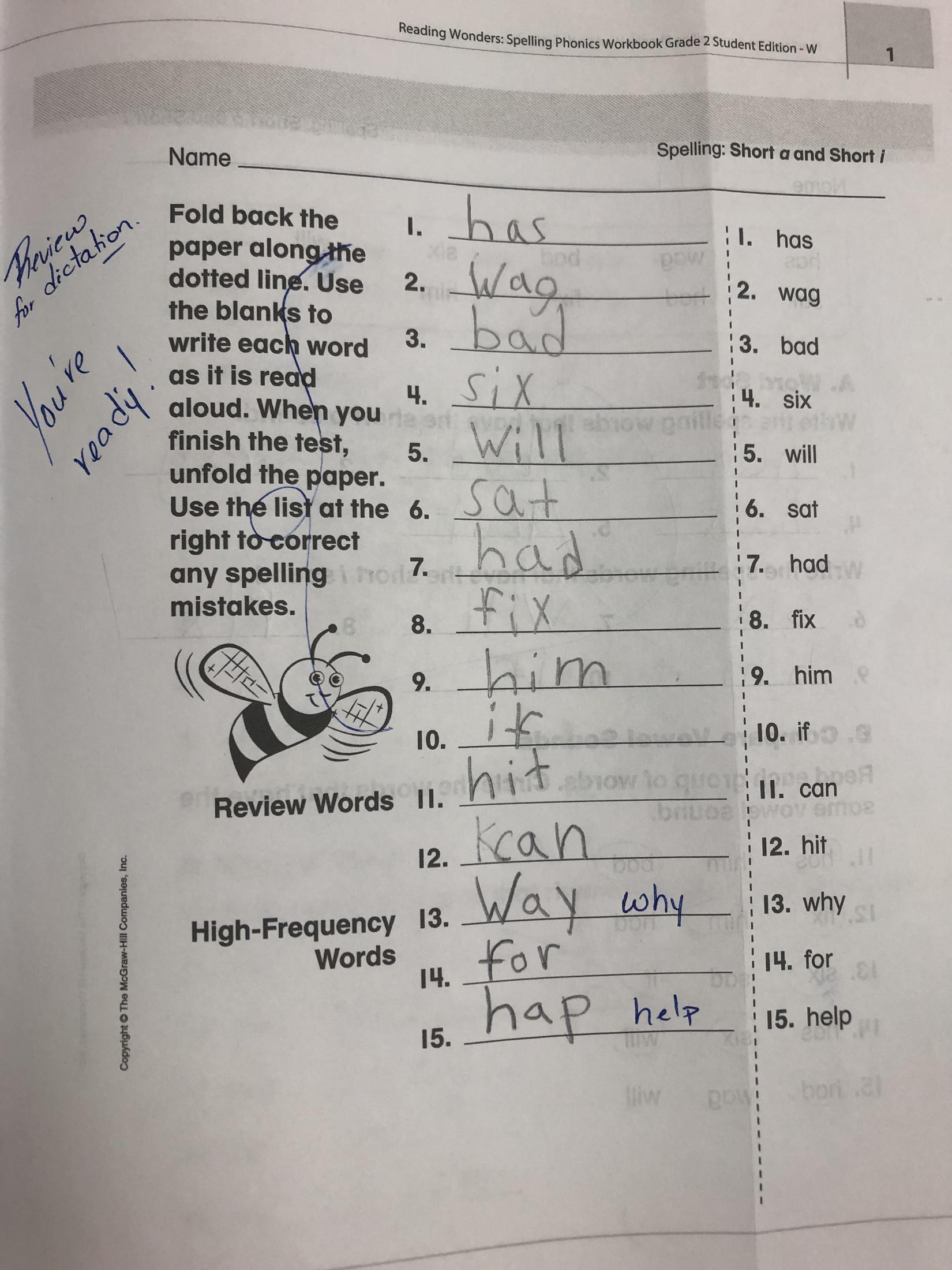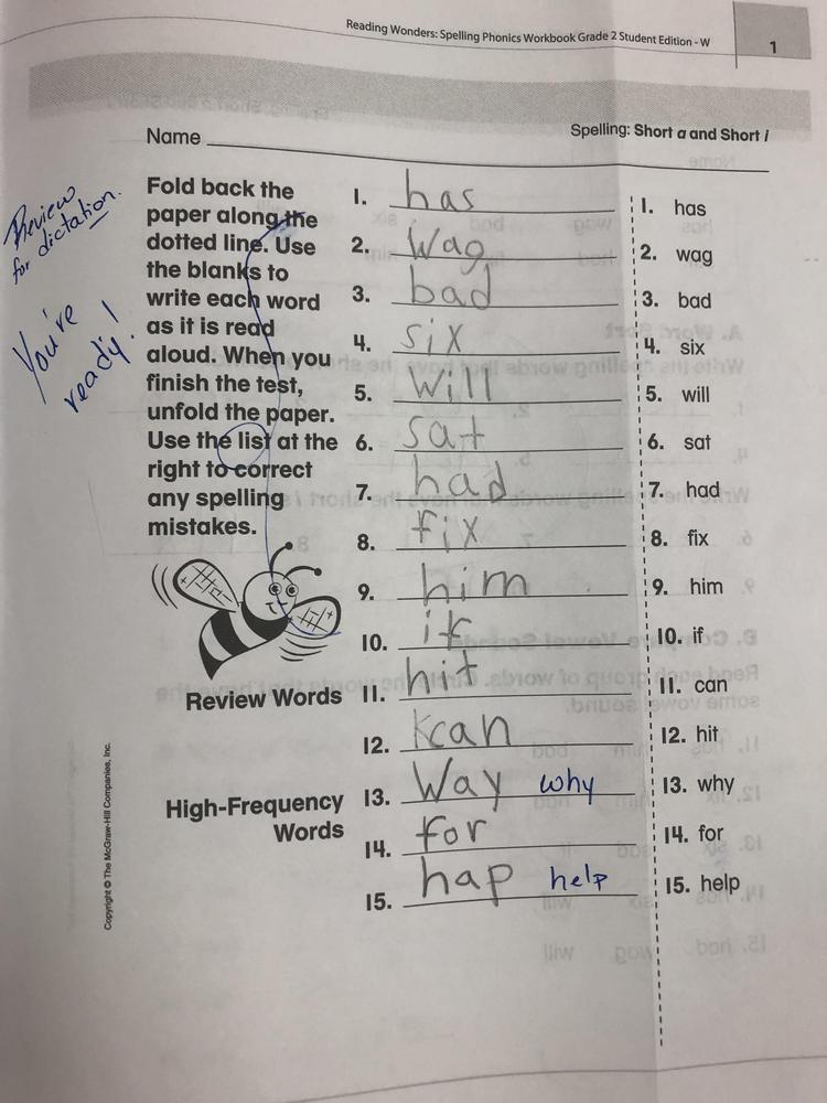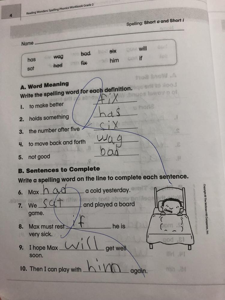 Page four (4) from the Spelling-Phonics Workbook done today in the classroom.