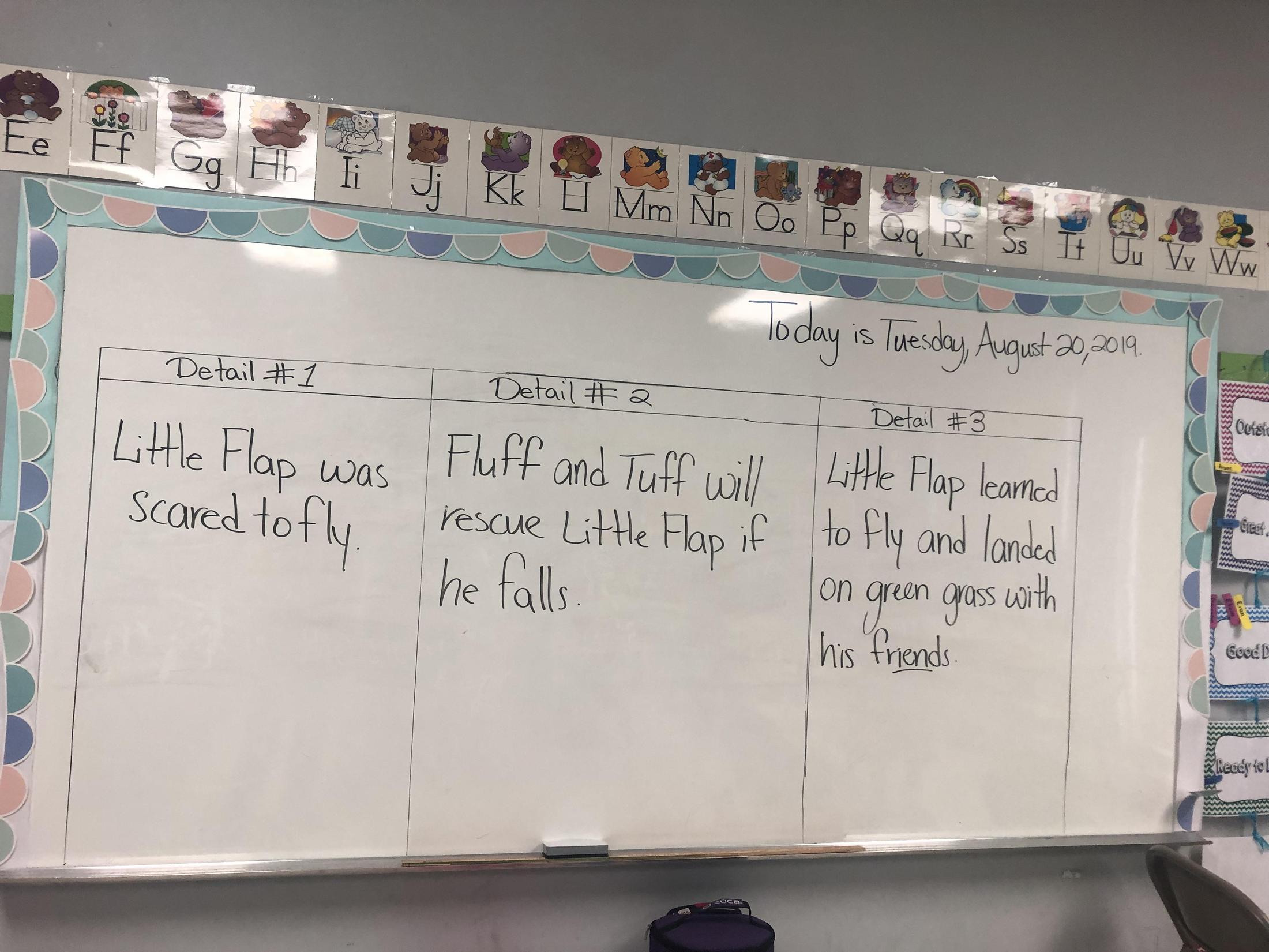We practice by finding the key details of the story "Little Flap Learns to Fly". We read the story last Friday.