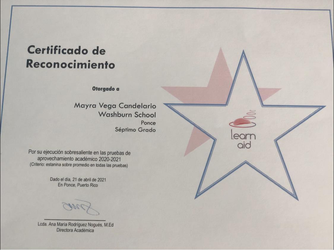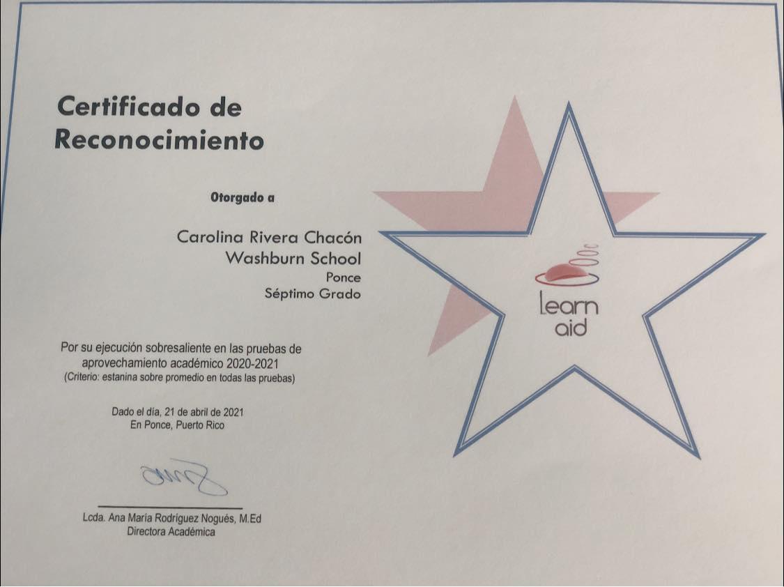 Los siguientes estudiantes salieron sobre promedio el indicé de aprovechamiento académico en las pruebas Learn Aid de en lectura en Español, lectura en Inglés, razonamiento no verbal y matemática.