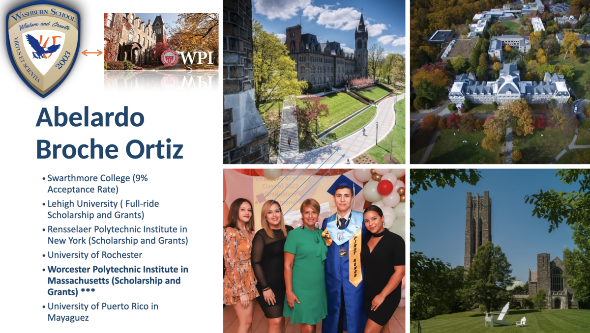 Washburn School 2021 Senior Highlight - Queremos felicitar a Abelardo Broche Ortiz, quien completó su primer trimestre en Worcester Polytechnic Institute en el estado de Massachusetts, donde estudia su bachillerato en "Computer Science". Abelardo obtuvo aceptaciones universitarias en este verano a: