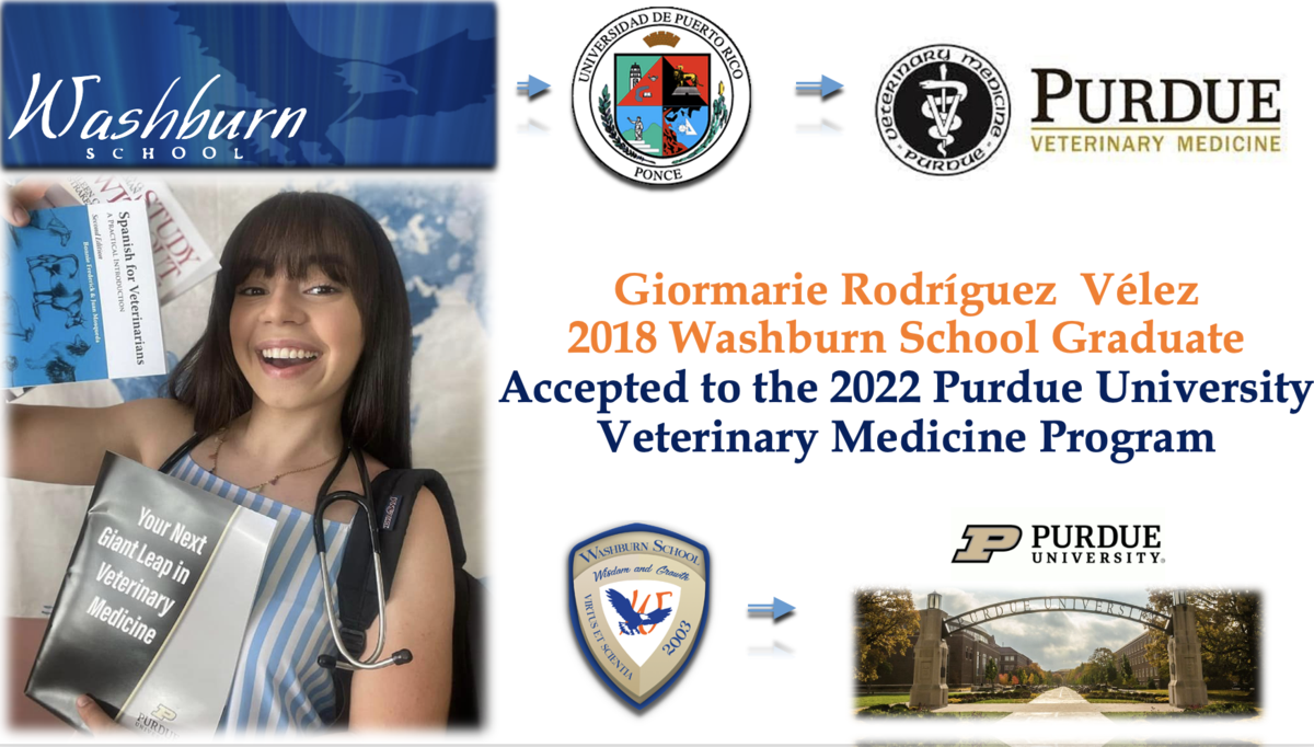 Felicitamos a Giormarie Rodríguez Vélez, graduada en el 2018 de la Escuela Washburn en Ponce, Puerto Rico, quién fue aceptada en el Colegio de Medicina Veterinaria de la Universidad de Purdue (Purdue University). La tasa de aceptación de la escuela de Medicina Veterinaria de Purdue está por debajo del 5.5% y solamente aceptaron 86 estudiantes para el 2022. Giormarie se une a una larga lista de estudiantes de Washburn que han sido aceptados en prestigiosas escuelas profesionales y de programas de posgrado en todo el mundo, en solo siete clases graduadas de Washburn School.